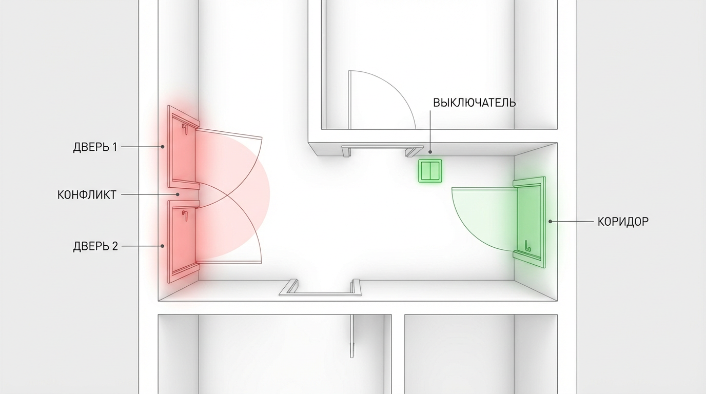- Последствия: Две соседние двери при одновременном открытии бьются друг об друга ручками, блокируют проход или перекрывают выключатель света.