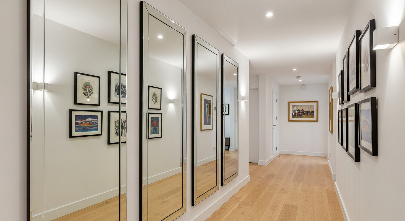 - Как это работает: Повесьте большое зеркало (или несколько зеркал) на длинную стену в узком помещении — коридоре, прихожей. Это моментально "раздвинет" стены.