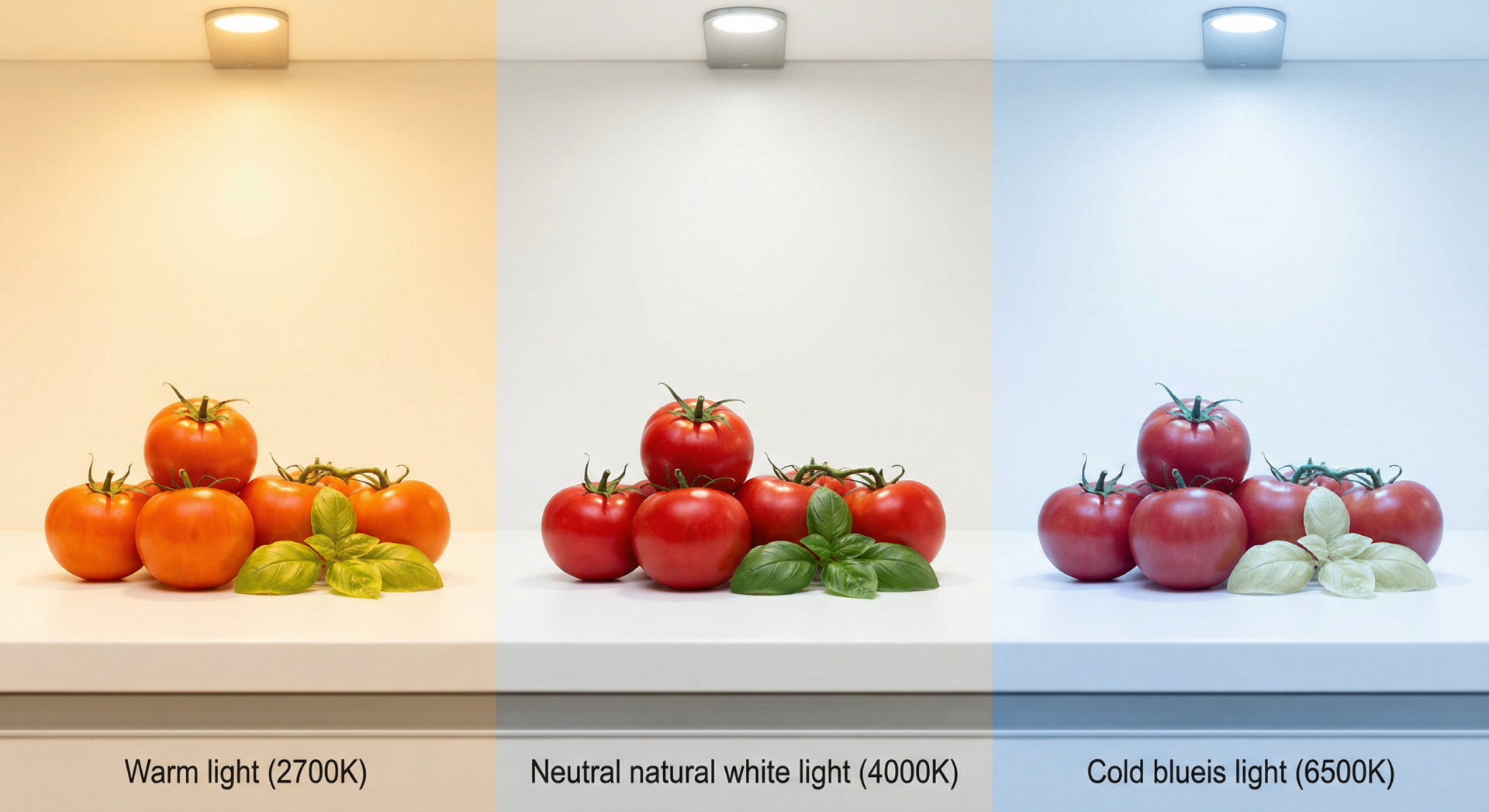 Для рабочей зоны, где важна точность и правильная цветопередача продуктов, идеальным выбором является нейтральный белый свет (4000-4500 К).