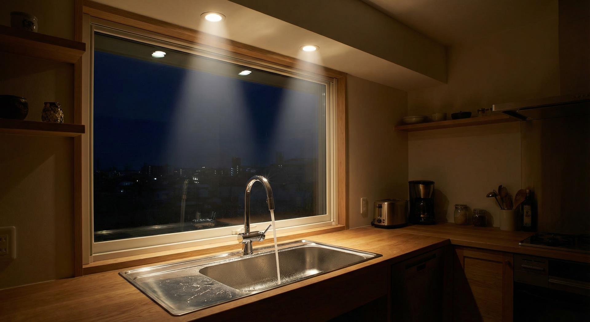 Если мойка расположена не под шкафами, а, например, у окна, света от общей люстры может не хватать. Решением станут встраиваемые точечные светильники в потолке, расположенные прямо над зоной мойки. Обязательно выбирайте влагозащищенные модели (с классом защиты не ниже IP44).