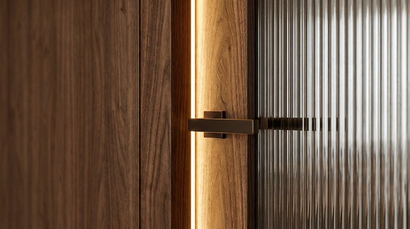 Шпон и рифленое стекло: Контрастный шпон с выраженным рисунком дерева добавляет тепла. А рифленое стекло в перегородках и фасадах мебели создает эффект туманной дымки, зонируя пространство, но сохраняя «воздух».