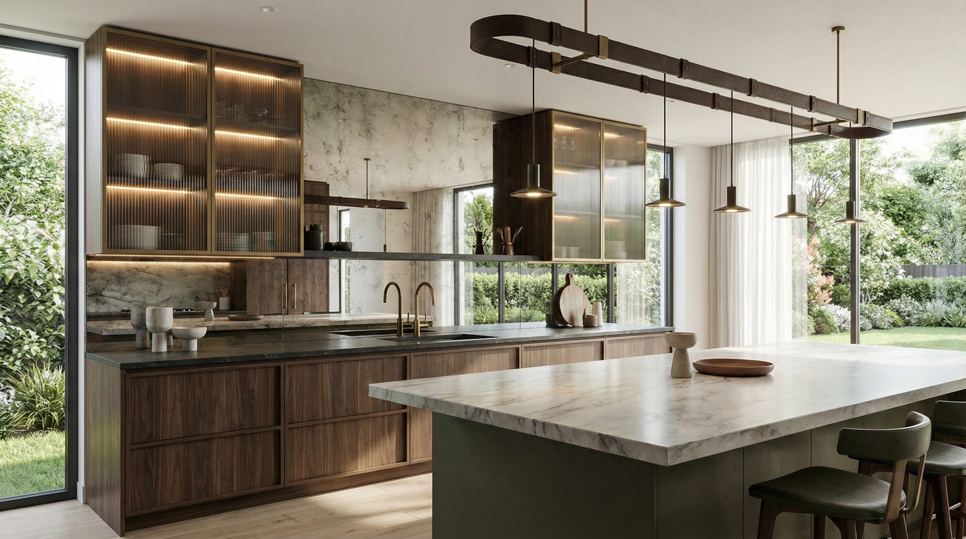 Зеркала на кухне: Неожиданный тренд — использование зеркал в кухонных фартуках и фасадах. Это добавляет рабочей зоне гламура, легкости и визуально расширяет помещение.
