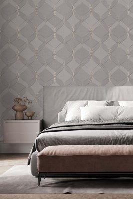 Фактура обоев имитирует текстиль — мягкую тканевую основу с лёгким рельефом, похожим на плотный шёлк или льняное полотно, что придаёт материалу приятную тактильность. Узор украшен перламутровым покрытием: тонкий слой жемчужного напыления отражает свет, создавая переливы: от матового сияния до лёгкого блеска. Цветовая палитра коллекции охватывает нюансы серо-бежевого спектра, от холодного серебристого до тёплого песочного. Среди них: серый с холодным металлическим отливом, кремовый бежевый с мягким молочным подтоном, светло-серый с лёгким дымчатым оттенком, тёплый коричневый, близкий к мокко, глубокий графитовый с серебристыми бликами и платиновый с перламутровым сиянием. Мотивы дополнены однотонными фонами в тех же оттенках, которые позволяют создавать комбинации в интерьере, используя узор на акцентной стене. Эта коллекция идеально подойдёт для минималистичных, скандинавских и современных интерьеров, где ценится сдержанная элегантность. Она гармонирует с нейтральной мебелью из натуральных материалов, добавляя глубину светлым пространствам. Перламутр и текстильная фактура усиливают премиум-эффект, делая обои подходящими для городских квартир и загородных домов с акцентом на уют и стиль.