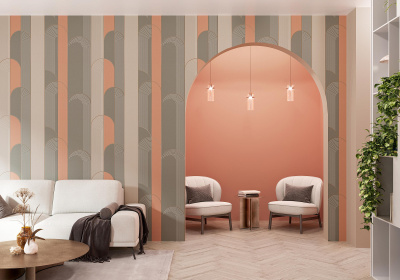 Сочетание геометрических паттернов и фактуры шелковой штукатурки превращает стену в арт-объект. Благодаря мерцающему напылению из перламутровых микрочастиц под разными углами стена «оживает»: геометрия остается четкой, а штукатурка переливается.