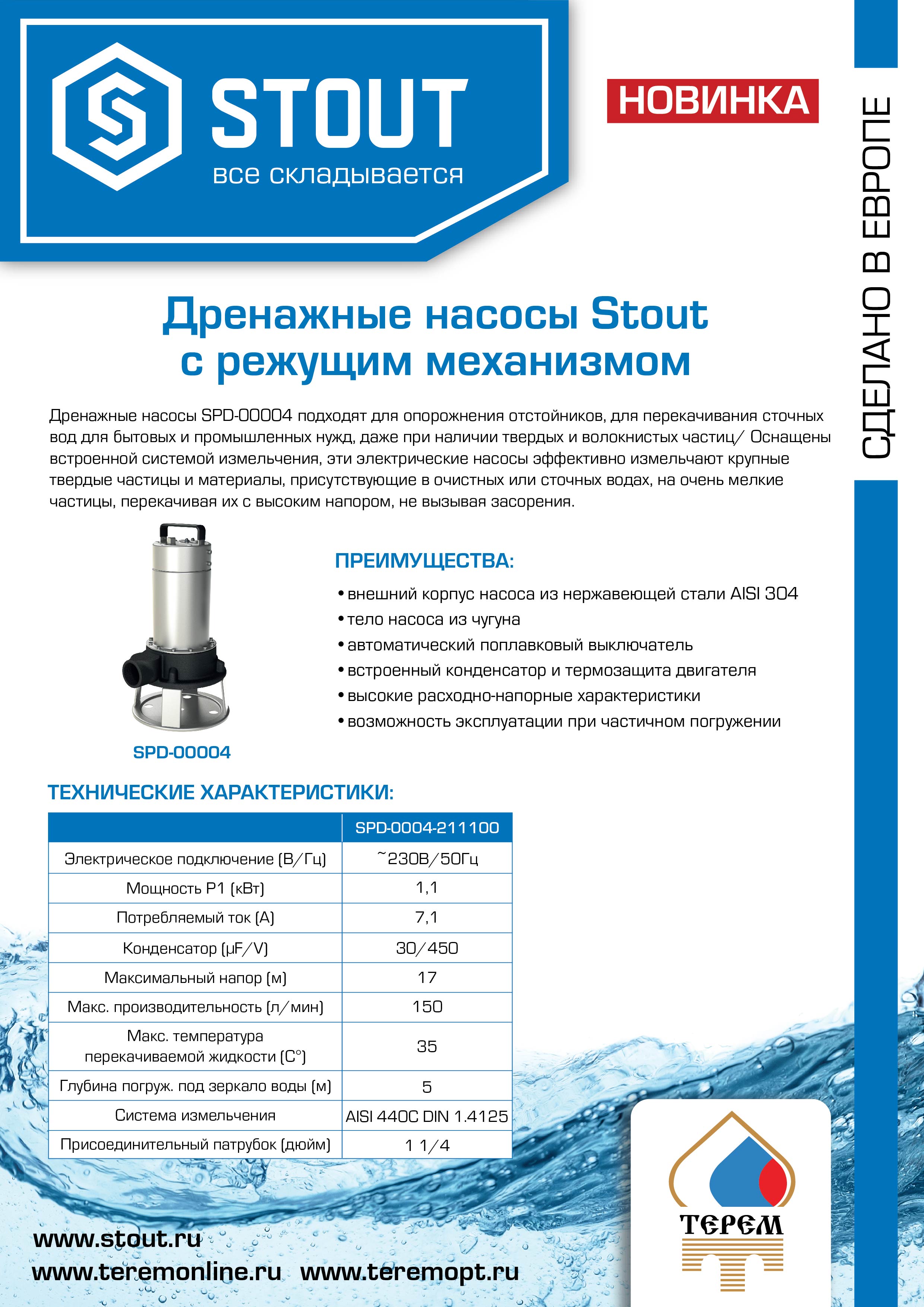Насос работает от стандартной сети 220 В и предназначен для перекачивания жидкости температурой до +35°C. Модель Stout SPD-0004 — это практичное решение для бытового и профессионального использования, где важны автономность, мощность и долговечность.